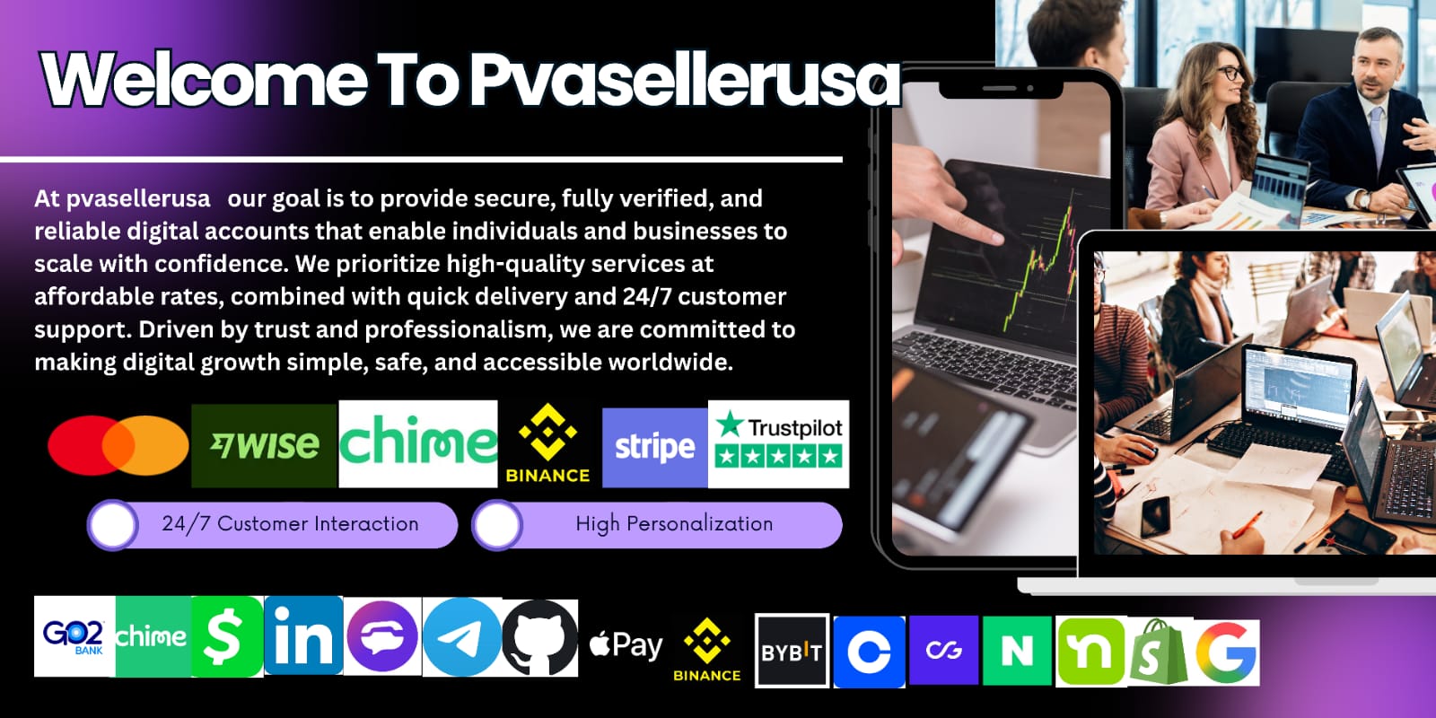 Our vision is to become a globally trusted leader in providing verified digital account solutions, recognized for our reliability, integrity, and customer satisfaction. We aim to set new standards in the industry by offering secure, compliant, and ready-to-use accounts that support individuals, startups, and established businesses across multiple countries. As digital platforms continue to evolve, we envision a future where our services help users seamlessly adapt and succeed without barriers related to verification or access.